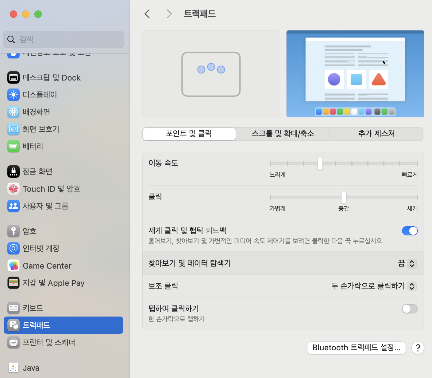 "시스템 설정 > 트랙패드 > 찾아보기 및 데이터 탐색기 > 끔" 으로 설정